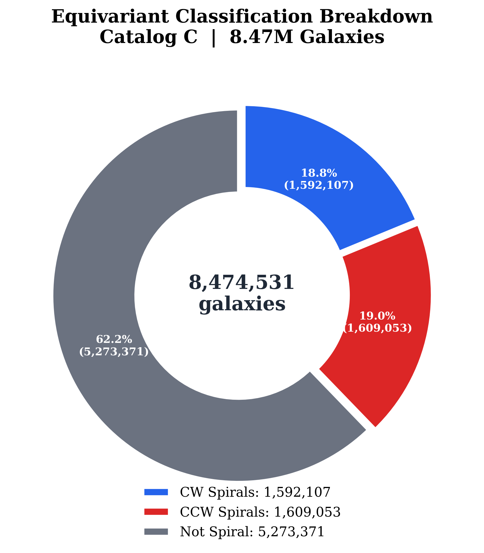 Comprehensive analysis of 8,474,531 galaxies — the largest galaxy chirality catalog ever produced. 100% coordinate match with GZ DESI Zenodo catalog. 949,584 high-confidence spirals (confidence > 0.6).