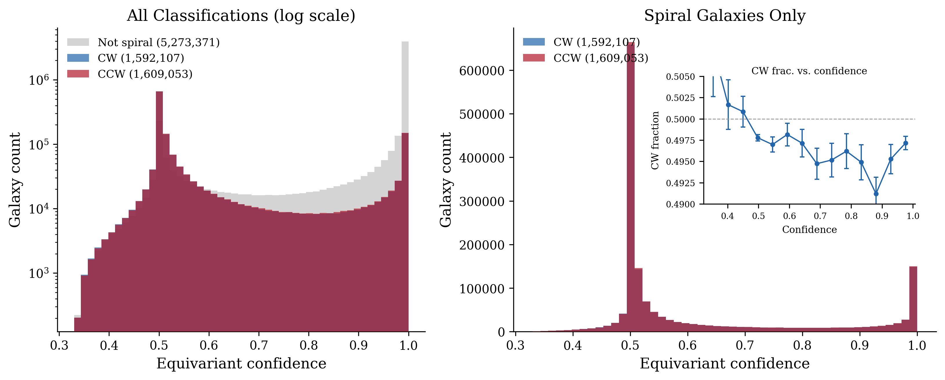 Browse the largest galaxy chirality catalog ever produced: 8,474,531 galaxies classified by spiral chirality using a ViT-Small vision transformer with test-time equivariant averaging. Dipole significance: 0.43σ (null — no parity violation detected). CW/(CW+CCW) = 0.4974, all sky regions within 0.5% of 50/50. Search by sky position, filter by classification and confidence, and explore the all-sky distribution.