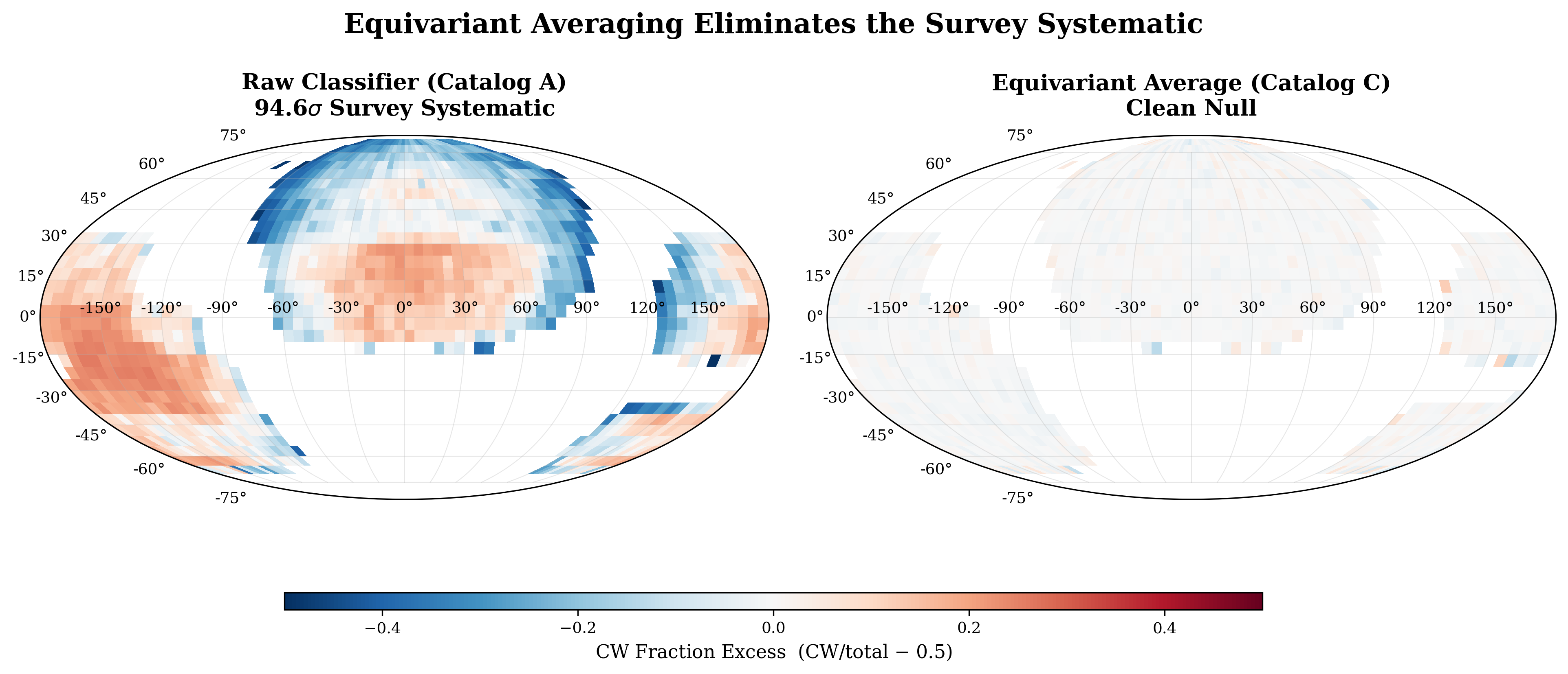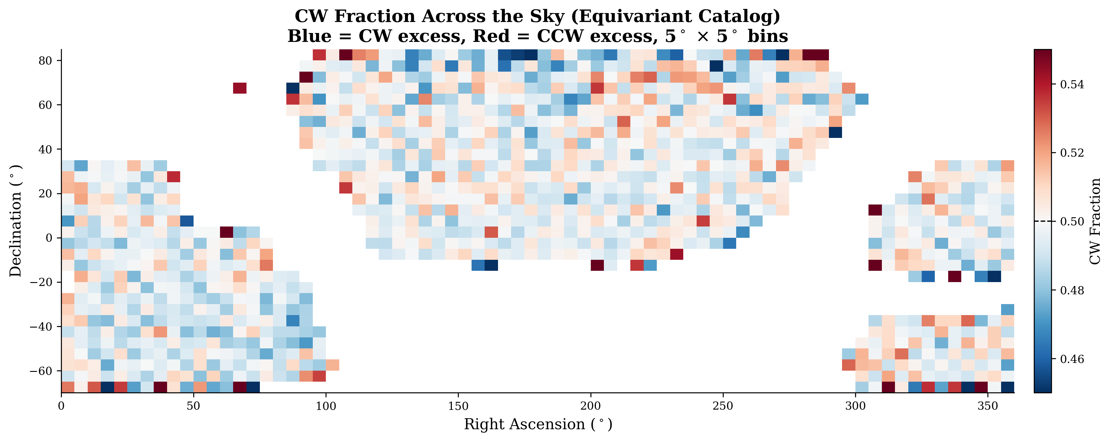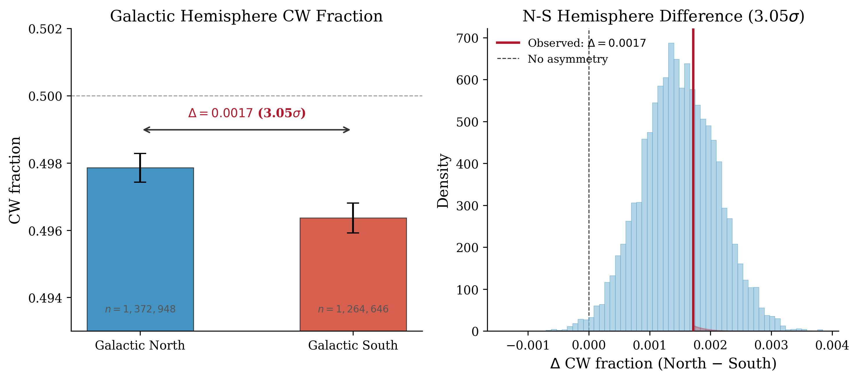The strongest individual signal is a north-south hemisphere asymmetry at 3.05σ (p = 0.002): northern hemisphere CW fraction = 49.81%, southern hemisphere CW fraction = 49.64%, a difference of 0.17 percentage points. This is a marginal result — it does not survive look-elsewhere correction across the multiple tests performed (dipole, hemisphere, multipoles l=1–10, CMB alignment, scale dependence). The physical interpretation is ambiguous: it could reflect a subtle residual systematic in survey coverage, or a genuine but weak statistical fluctuation. It does not constitute evidence for large-scale parity violation.