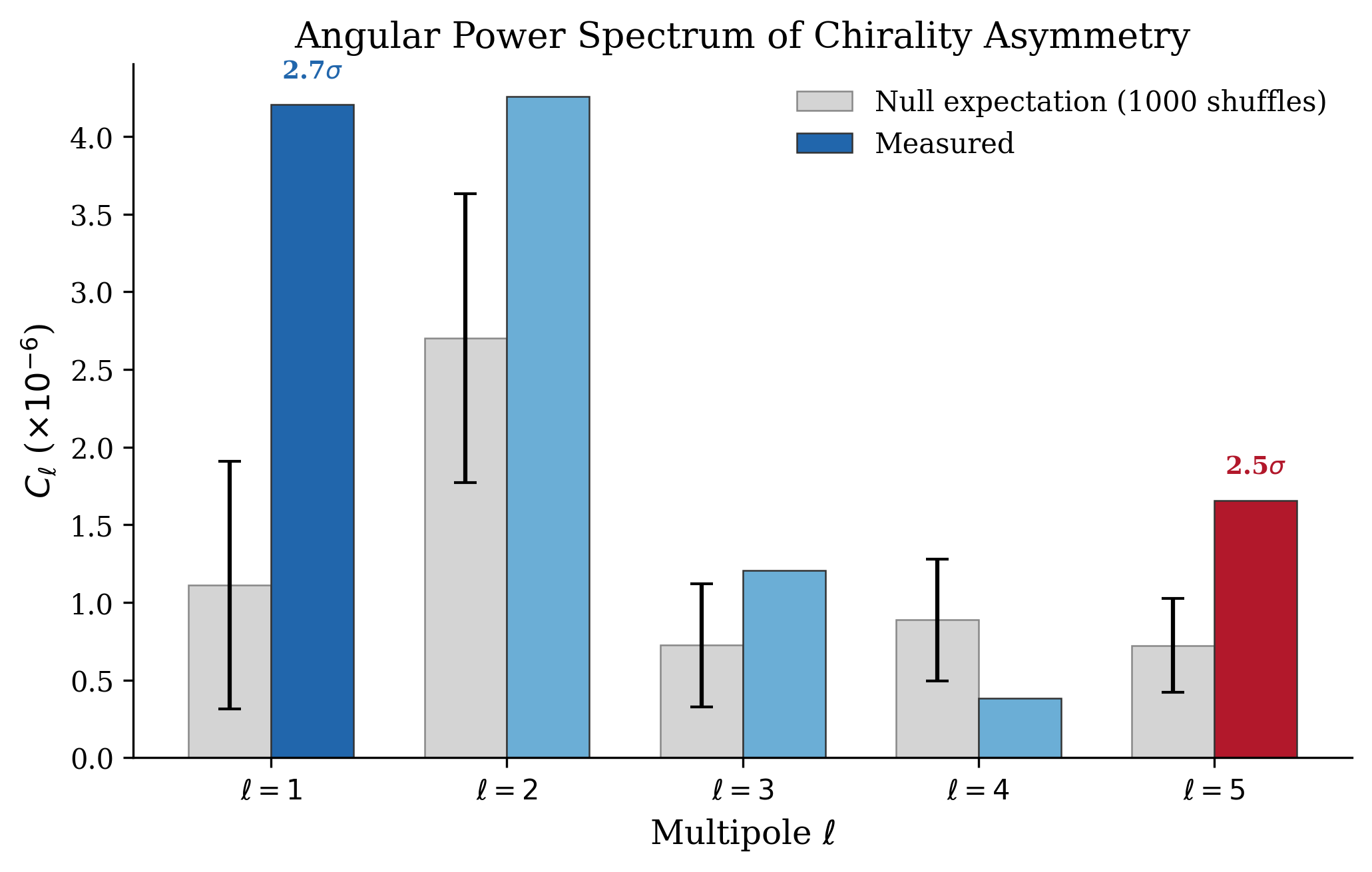 Simple dipole: 0.43σ. Power-spectrum dipole: 2.75σ (marginal). No significant large-scale parity violation detected.
