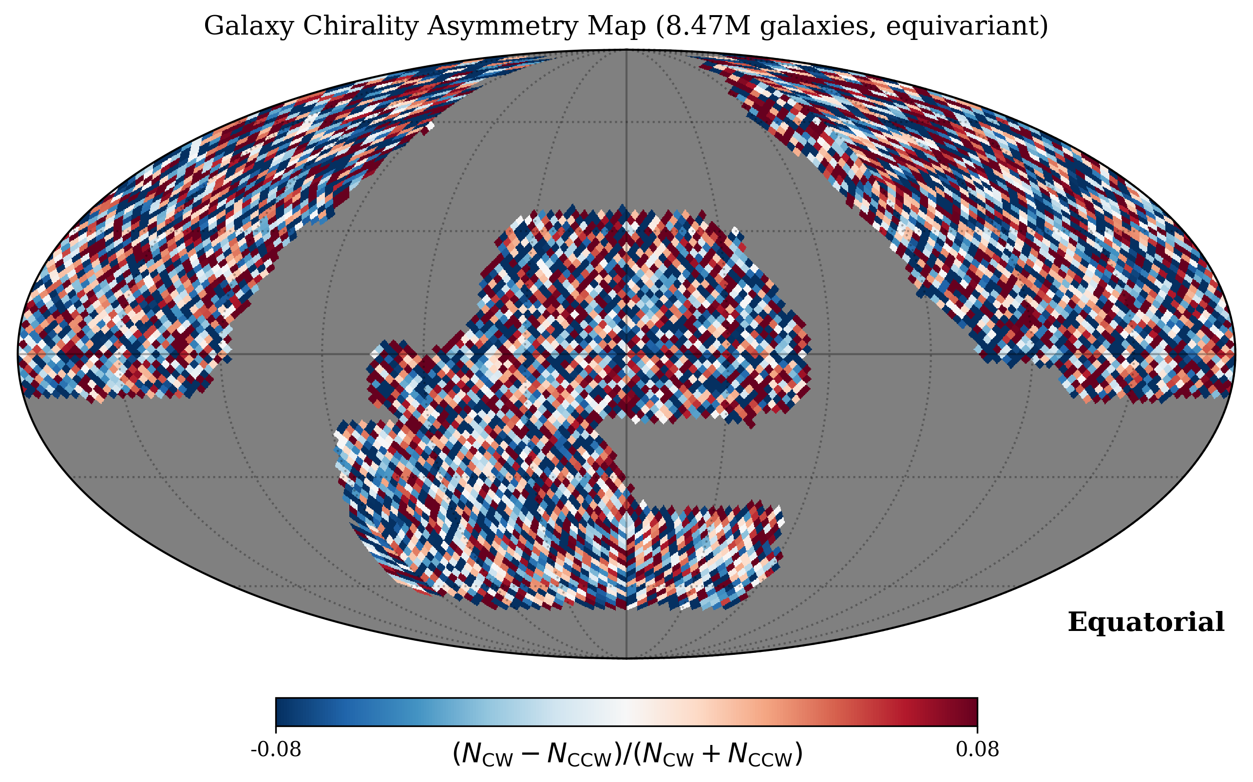 Mollweide projection of spiral galaxy classifications across 8.47M galaxies. The distribution is essentially uniform. Global dipole is null (0.43σ). A marginal hemisphere asymmetry (3.05σ, north CW=49.81% vs south CW=49.64%) does not survive look-elsewhere correction. CMB dipole alignment is null (85.4° separation).